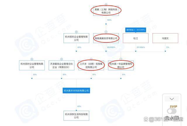 股权全景穿透图显示,该公司由天津嘉锐企业管理合伙企业(有限合伙)、合肥三只羊创业投资有限公司、杭州辰时企业管理有限公司、杭州美一华品牌管理有限公司共同持股,其中合肥三只羊创业投资有限公司为“疯狂小杨哥”旗下公司,杭州美一华品牌管理有限公司由美腕旗下海南美腕投资有限公司持股29.6%。