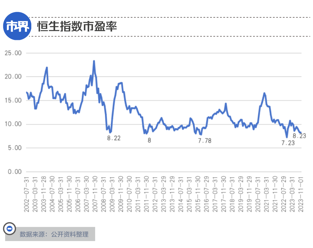 事实上,如果看恒生指数当前的滚动市盈率,只有8.23,而过去20年恒生指数市盈率均值为12.25,过去10年则是10.49。从下图也可看出,当前恒生指数市盈率不仅低于均值,也几乎处于过去20余年的最低水平。