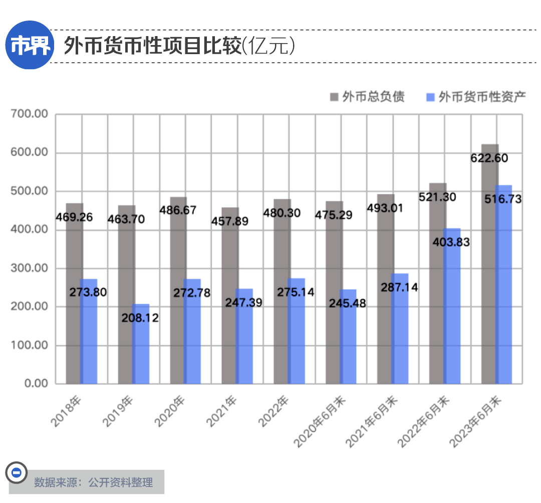 梳理年报数据可见,2018年到2022年,美的集团的外币货币性资产(包括外币货币资金、外币应收账款、外币其他应收款)合计金额都在208亿元到275亿元之间,外币货币性负债(包括长短期借款、应付账款、其他应付款、应付债券等)则在458亿元到493亿元之间,外币货币性资产始终低于负债。