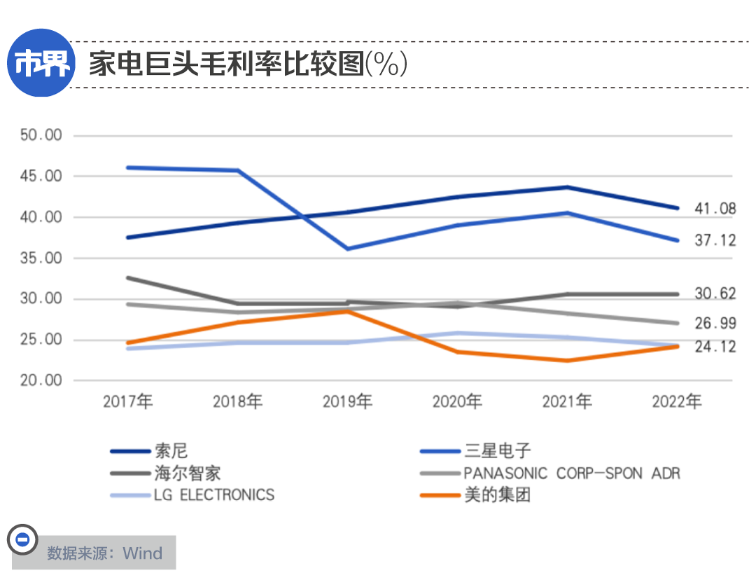 在这背后,三星有领先的半导体业务作为整体毛利率的支撑,索尼有更具优势的影音技术,松下的空调、洗衣机等产品则在高端领域占有一席之地。