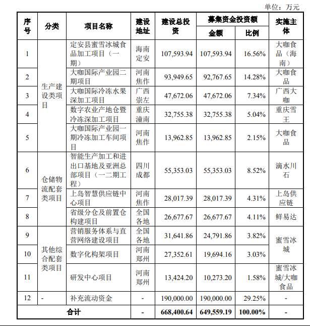 据招股书显示,蜜雪冰城曾拟公开发行不超过4001万股人民币普通股,拟募集资金64.96亿元,投向12个项目,包括5个生产建设类项目、3个仓储物流配套类项目、3个其他综合配套类项目以及补充流动资金。其中,有19亿元将用于补充流动资金。