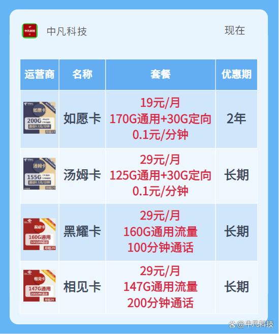 流量卡19元100g全国通用推荐:移动、电信、联通19元套餐19元100g流量卡是一款非常实惠的流量套餐,适用于广大手机用户。很多人在购买时会疑惑这款流量卡到底在哪里可以购买。本文将从四个方面详细阐述电信19元100g流量卡的购买渠道,帮助大家更好地了解购买该套餐的方式。 全民流量卡小编今天给大家一个硬通货!19元的100G全国流量卡包含中国电信、中国联通、中国移动三大运...... 选卡攻略2023-10-11